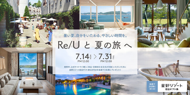 2025年7月14日(月)~31日(木)の期間中、Re/U商品をご購入いただいた方の中から抽選で2名様に全国の星野リゾートで使える「宿泊ギフト券(5万円分)」をプレゼント。