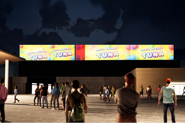 また、「ツナグ-キャンバス」は企業様のPRだけでなく、個人の方の記念メッセージにもお使いいただけます。プロポーズなどの一世一代の告白、誕生日・結婚記念日・還暦などの記念日祝い、推しを祝ったり応援したりする推し活等、さまざまなシーンでのご利用を想定したクリエイティブをご用意しておりますので。ぜひ一生に一度のイベントとしてもご検討いただき、共に盛り上がることができればと思います。