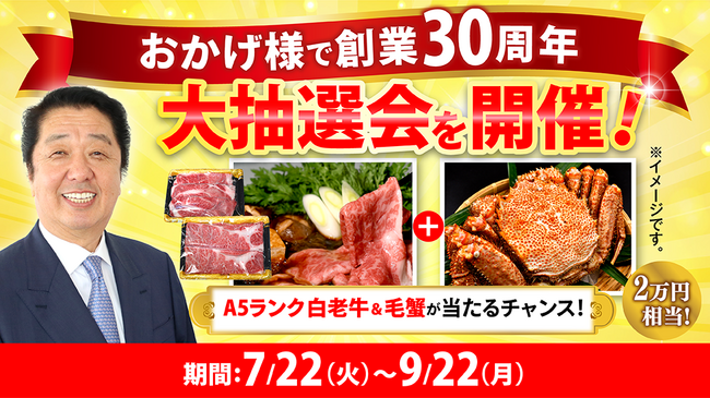【創業30周年】北海道から感謝を込めて。TV通販のJCCショップが、7月22日(火)より『大抽選会』を開催。2万円相当のA5ランク白老牛&毛蟹が当たるチャンス。