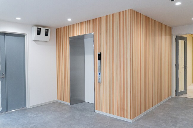 今後の事業拡大を見据えて、新社屋の建設を検討されていた株式会社TKJ。新社屋には、企業のブランディングイメージに合わせ、「樹温」に加えて、同製造元が手掛ける天然木の極薄クロス「MOCROSS(エムオークロス)」を取り入れた設えを採用されています。