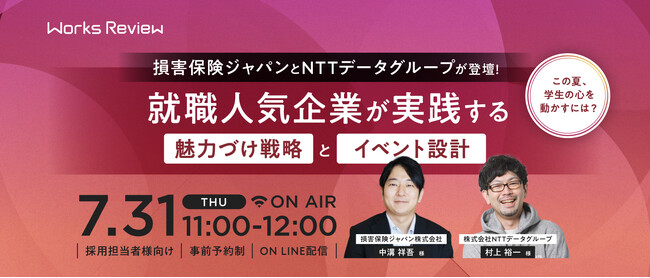 【7.31|無料ウェビナー開催】損害保険ジャパンとNTTデータグループが登壇! この夏、学生の心を動かすには? 就職人気企業が実践する 魅力づけ戦略とイベント設計|WORKS REVIEW