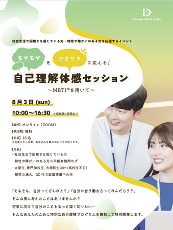 特定非営利活動法人ディーセントワーク・ラボ(東京都大田区、代表理事:中尾文香)は、障がいのある学生が自己理解を深め、社会生活でのコミュニケーション力を向上させるセミナーの一環として、8月3日(日曜)【「モヤモヤ」を「ワクワク」に変える!自己理解体感セッション~MBTI (R)を用いて~】を特別開催します。