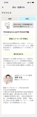 カルテコでは、センシング(非接触型生体情報取得)技術を使って自律神経のバランス、トータルパワー、脈拍数、呼吸数を計測できます。またカルテコ利用者は、自律神経のバランスなどを計測した上で、生活習慣を見直すヒントを得ることができます。睡眠の質改善や良好な休息を取るためのアドバイスの監修は、睡眠コンサルタントの友野なおさんにご担当いただきました。また、「食」に関するアドバイスは、みぞぐちクリニック(東京・八重洲)の溝口徹院長に監修していただいています。