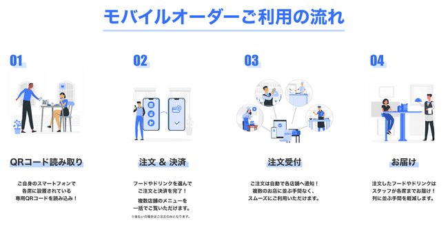 - 待ち時間の短縮テーブルオーダー採用により、お客様は座席のQRコードから注文と決済が完了するため、注文時の行列緩和と待ち時間短縮を実現します。