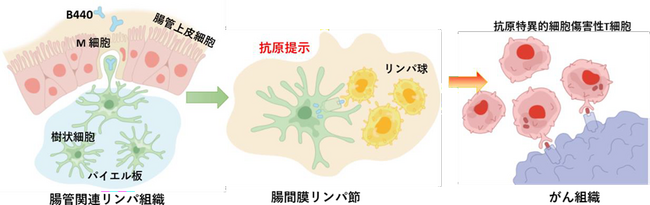 経口投与された B440 は腸管上皮中の M 細胞からパイエル板中の樹状細胞に取り込まれ腸間膜リンパ節に移動します、B440 が提示していた抗原タンパク(腫瘍抗原 WT1)は樹状細胞内で処理され、その断片が樹状細胞表層に抗原提示されます。この抗原提示樹状細胞がリンパ節内のリンパ球を活性化し、がん細胞を攻撃する細胞傷害性 T 細胞を誘導します。