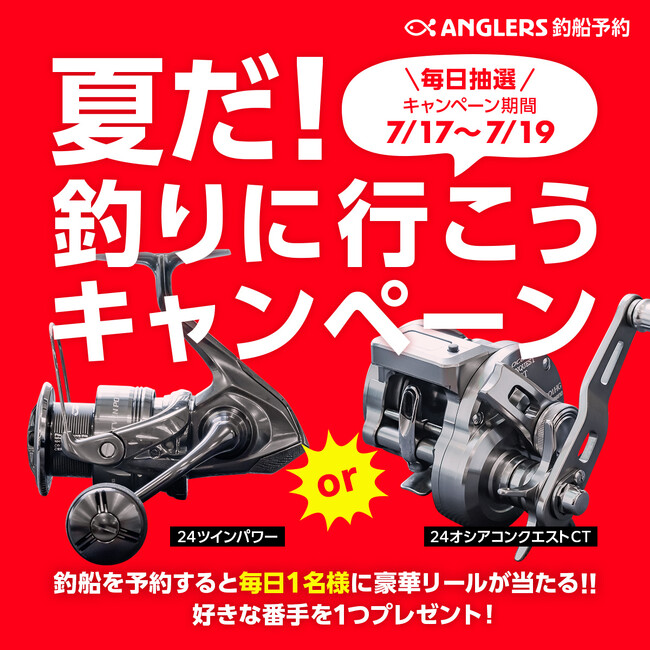 株式会社アングラーズ(本社:東京都町田市、代表取締役:若槻嘉亮)は、釣船予約サービス「アングラーズ釣船予約」にて、豪華リールが当たる「夏だ!釣りに行こうキャンペーン」を2025年7月17日(木)~19日(土)の3日間限定で開催いたします。キャンペーン期間中に「アングラーズ釣船予約」から予約送信いただいた方の中から、毎日1名様に大人気のSHIMANO(シマノ)製リールをプレゼントします。