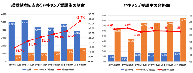 2025年5月のFP1級学科試験において、総受検者3,909名のうちFPキャンプ受講生が占める割合は42.7%※1となり、全体の4割超に達しました。FPキャンプが開講した2023年7月以降、受検者に占める受講生の割合は6回連続で右肩上がりの成長を続けています。また、今回のFPキャンプ受講生の合格率は85.71%※2と、全体の合格率18.75%の約4.6倍を記録。2023年7月以降の試験において、6回連続で全体合格率の4.5倍を超える高い合格率を達成しています。