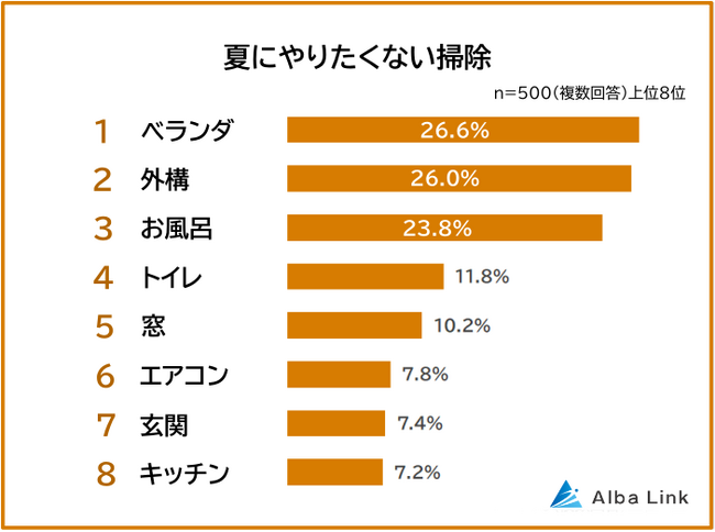 今回、株式会社AlbaLink( https://albalink.co.jp/)が運営する訳あり物件買取ナビ( https://albalink.co.jp/realestate/)は、全国の男女500人を対象に「夏にやりたくない掃除」についてアンケート調査を実施しました。