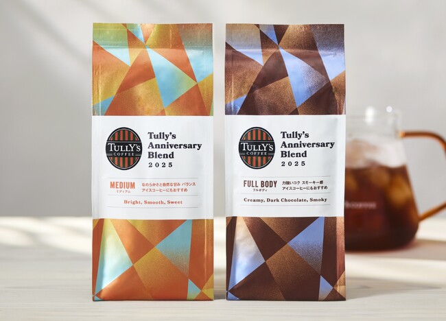 タリーズコーヒーは、8月7日の創業日を記念し、お客様へ日頃の感謝を込めて「タリーズアニバーサリーブレンド」を毎年お届けしています。ブラジル、パプアニューギニア、タンザニア、インドネシアの4つの生産地のコーヒー豆を使用し、豆ごとに最適な焙煎をした後にブレンドするアフターミックス製法で、各産地の個性を活かしながらもバランスのとれた、奥行きのある味わいに仕上げました。明るい印象の「ミディアム」と、スモーキーで力強い「フルボディ」の焙煎度が異なる2つの味わいは、気分やシーンに合わせてお楽しみいただけます。今年のパッケージは、「タリーズアニバーサリーブレンド」の“上品で何層にも折り重なる味わい”をイメージしています。今しか味わうことのできない、特別なブレンドをホットはもちろん、アイスでも飲み比べてお楽しみください。
