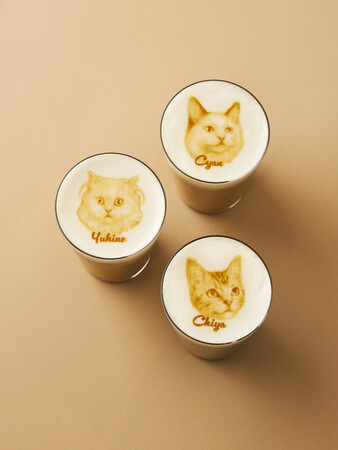 20~30種のネコ達からお気に入りのネコのデザインを選べる。店舗在籍ネコ達のオリジナルデザインアート付きドリンク