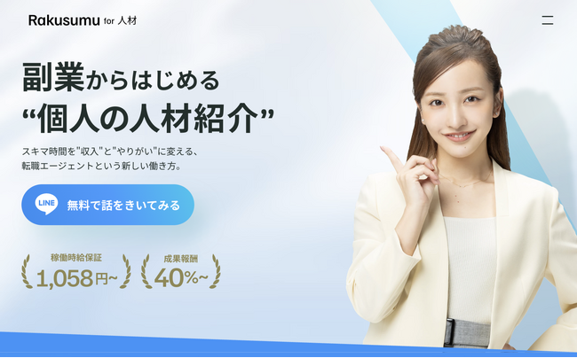 Rakusumuは審査を通過された方が個人の人材エージェントとして活動できるサービスです。