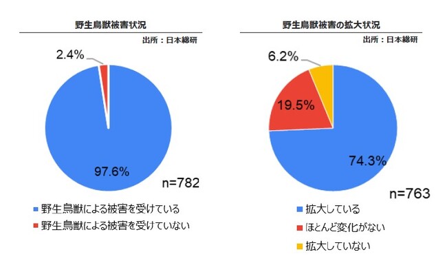 何らかの野生鳥獣被害を受けていると回答した基礎自治体は、全体の97.6%(763団体)に上りました(図1)。また、被害を受けていると回答した基礎自治体のうち、被害状況が「拡大している」としたのは74.3%でした。この結果から、野生鳥獣被害が全国的に拡大傾向にあることが分かります。