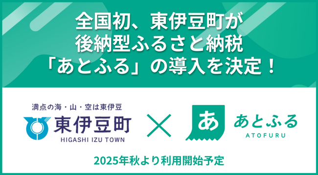 株式会社電算(本社:東京都中央区、代表取締役社長:河野 純、以下「電算」)と静岡県東伊豆町(町長:岩井 茂樹、以下「東伊豆町」)は、地域消費を起点とする後納型ふるさと納税サービス「あとふる」*1 の導入について合意し、同町での本格運用を共同で進めることを決定しました。東伊豆町は「あとふる」を正式導入する全国初の自治体となります。
