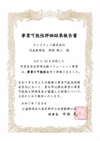 IoTとAIにより作業員の安全管理にイノベーションを起こすセンスウェイ株式会社(本社:東京都中央区、代表取締役社長CEO:神保雄三、以下「センスウェイ」)が展開しているIoTとAIを活用した作業員安全管理支援ソリューション事業「ワーカーコネクト」は、(公財)東京都中小企業振興公社の事業可能性評価事業(令和7年度6月期)において「事業可能性あり」と評価を受けましたのでお知らせいたします。