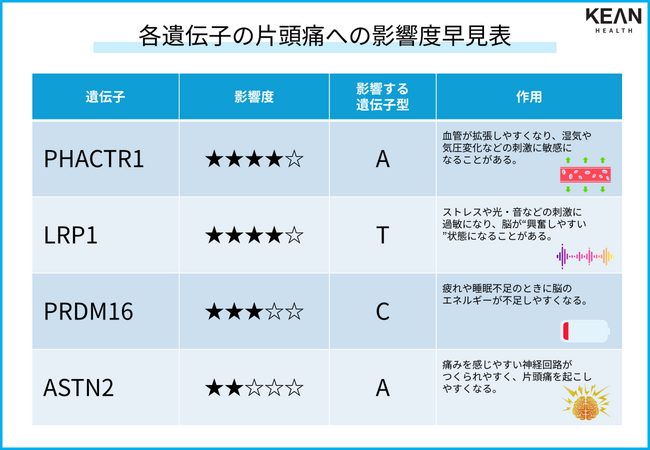 近年の研究では、片頭痛に関わるいくつかの遺伝子が明らかになっています。今回、専門的な研究やデータをもとに、片頭痛に関与する代表的な遺伝子を影響度の早見表をまとめました。[画像1: https://prcdn.freetls.fastly.net/release_image/131089/16/131089-16-546ea0e90536e5c22c47e99de66d1126-2600x1800.png?width=536&quality=85%2C75&format=jpeg&auto=webp&fit=bounds&bg-color=fff ]