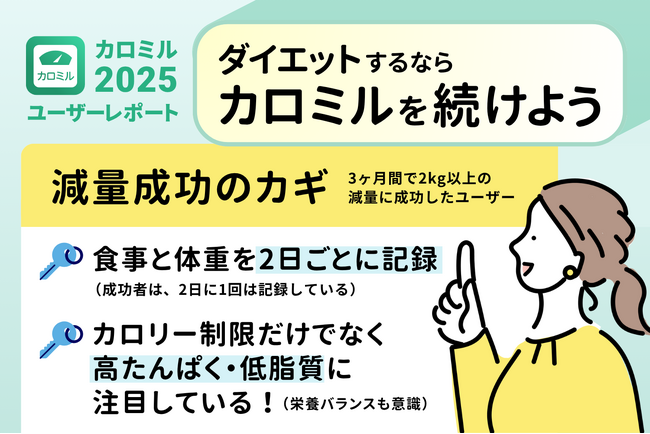 食事・運動・体重管理アプリケーション(以下アプリ)「カロミル」の開発・提供をするライフログテクノロジー株式会社(東京都中央区、代表取締役:棚橋繁行、以下当社)は、ダイエットを目的としてカロミルを利用しているユーザーの記録内容やその頻度などについて調査を行いました。調査の結果、3ヶ月間で2kg以上の減量に成功したユーザーは、だいたい2日ごとに食事と体重を記録していることがわかりました。また、プロテインや鶏むね肉などの高たんぱく・低脂質な食材や低糖質メニューを積極的に摂取しており、栄養バランスにおいても7割以上がカロリー・脂質・糖質の基準値内におさめていることがわかり、栄養バランスを意識した食生活を記録することが減量結果に繋がっていることがわかりました。
