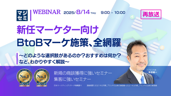 マジセミ株式会社は「(再放送)【新任マーケター向け】BtoBマーケ施策、全網羅」というテーマのウェビナーを開催します。