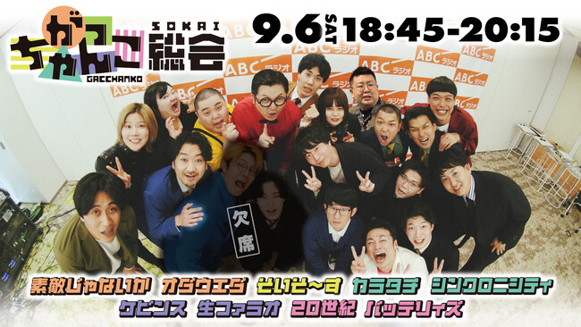 素敵じゃないか・オダウエダ・そいそ~す・カラタチ・シンクロニシティ・ケビンス・生ファラオ・20世紀・バッテリィズの9組が大集合し、『がっちゃんこ総会』と題して9月6日(土)に開催します。スタジオを飛び出し、リアルの場でもわちゃわちゃ声と体を張り尽くす90分。一癖も二癖もあるメンバーたちはリアルの場でどんな化学反応を見せてくれるのか!?ここでしか味わえない大共演をお見逃しなく!