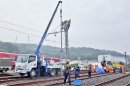 ⑤曲損した鉄柱,断線した電車線,倒壊した踏切警報機などの復旧