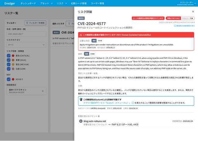 脆弱性情報において、クラウド型WAF「Scutum」による対応状況の表示を追加しました。Dredgerで発見された脆弱性のうち、Scutumで防御可能なものにはその旨が明示され、WAF導入の検討材料としてご活用いただけます。