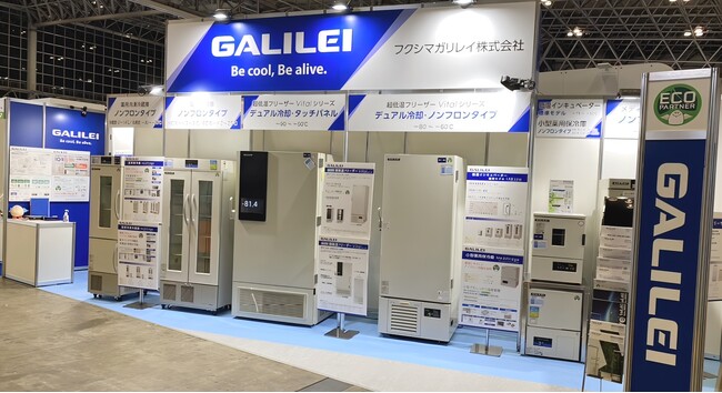 ガリレイブースでは、ノンフロン冷媒を採用した製品を数多くラインナップ。近日発売のメディカルフリーザー、検体や試料などの保管に使用する超低温フリーザー、スリム型薬用保冷庫、薬用冷凍冷蔵庫を出品します。またセキュリティに対応した電子錠付のスリム型薬用保冷庫を参考出品します。