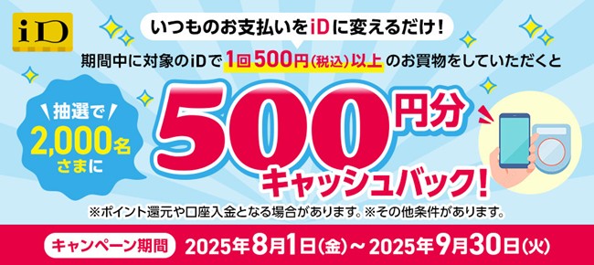株式会社NTTドコモ(以下、ドコモ)は、「iD利用で当たる!500円分キャッシュバックキャンペーン」(以下、本キャンペーン)を、2025年8月1日(金)から2025年9月30日(火)まで開催いたします。
