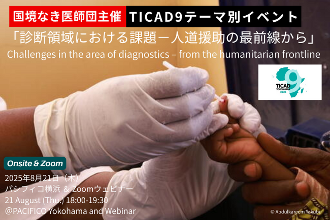 国境なき医師団(MSF)は、2025年8月21日(木)、横浜・第9回アフリカ開発会議(TICAD9)の会場にて、テーマ別イベント「診断領域における課題──人道援助の最前線から」を開催します。検査と診断なしには、治療も対策も始められない―本イベントは、公衆衛生において必須の入り口である“診断”にフォーカス。アフリカと日本の共創を考えるパネルディスカッションを行います。