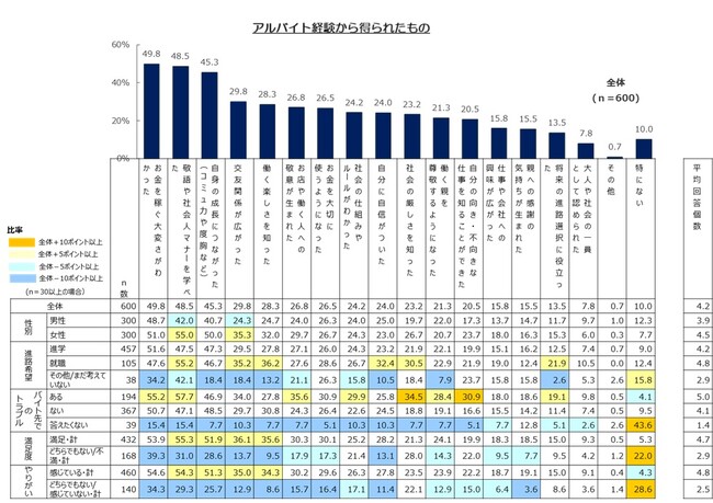 【アルバイト経験から得られたもの】「お金を稼ぐ大変さがわかった」49.8%、「敬語や社会人マナーを学べた」48.5%、