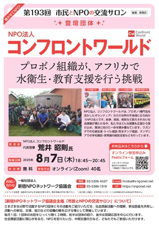 【第193回 市民とNPOの交流サロン:オンラインイベント】(登壇団体:NPO法人コンフロントワールド)を8月7日(木)、オンラインで開催します。参加費は無料。現在、参加者を募集中です。