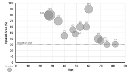 図:51枚以上のJACE®を使用した患者(H群)における年齢(横軸)、熱傷面積(縦軸)、使用枚数(円の大きさ)の関係。若年で広範囲の熱傷患者や、高齢でも比較的小範囲の熱傷患者の救命に貢献していることがわかる。