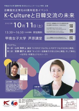 甲南女子大学(神戸市東灘区) 国際学部多文化コミュニケーション学科は、日韓国交正常化60年を迎えた節目の年に学科主催イベント「K-Cultureと日韓交流の未来」を開催します。