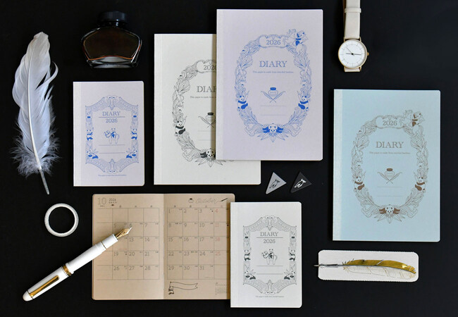 サイズはポケットサイズとB6サイズの2サイズ展開。フォーマットは人気の月間ブロック。日付の数字を好きな色で塗りつぶすことができたり、月名の英語表記やインクボトルのイラストを好みの色でなぞることで、自分だけのダイアリーに仕上げる楽しみがあります。六曜、月の満ち欠け、二十四節気などの表記も入っています。イヤープランやドット方眼ノートページもあり、手帳としての機能も十分です。表紙や本文中には、竹にちなんだ可愛いパンダのイラスト入り。