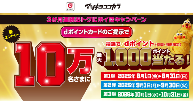 株式会社NTTドコモ(以下、ドコモ)は、全国のマツモトキヨシグループ・ココカラファイングループの対象店舗において、「3か月連続10万名さまにdポイント最大1,000ポイント当たる!キャンペーン(以下、本キャンペーン)」を2025年8月1日(金)から2025年10月31日(金)まで3か月連続で開催いたします。