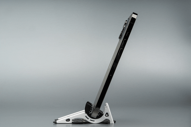 2本の脚を独立調整することで、不整地や傾斜でもしっかり設置可能。スマホを約1.27cm浮かせて設置できるため、地面の汚れからも守ります。