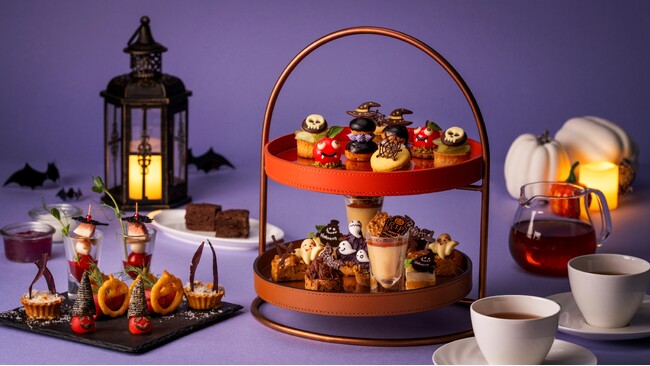 スイーツには、上段にカシスクリーム、下段は自家製マロンクリームを詰めた二段重ねのシュークリーム「ウィッチシュークリーム」や、リンゴの果肉とホワイトチョコを組み合わせた、赤いグラサージュが目をひくアップルケーキ「森のモンスターマッシュ」などをご用意。セイボリーにはクモの巣をイメージした「無花果とモッツァレラチーズのピンチョス ブラッドソース スパイダーチュイル添え」や、ジャック・オ・ランタンをモチーフにした「沖縄県産和牛と鮑茸のマリネ ジャック オ ランタントースト」などがお楽しみいただけます。