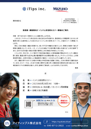 インドでの特定技能人材の育成から、日本での生活支援まで一気通貫で支援する特定技能人材育成支援プラットフォーム「oyakata」を展開するアイティップス株式会社(愛知県名古屋市、代表:クマール ラトネッシュ)は、株式会社みずほ銀行と、製造業・建設業におけるインド人材の活用をテーマとした共催セミナーを2025年8月28日(木)に開催いたします。