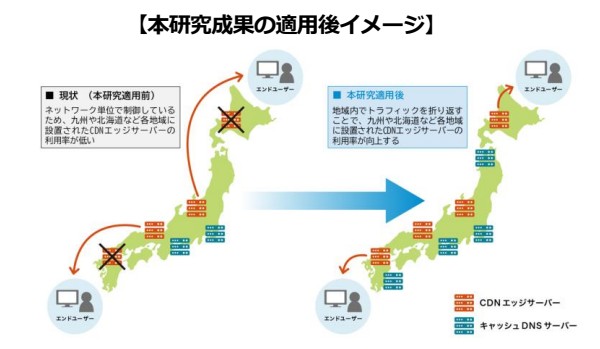 本研究の目的は、地域判別とCDN技術を活用して地域内でのトラフィックの折り返しを実現し、それにより、配信品質の向上やネットワークコストの削減効果を検証することです。
