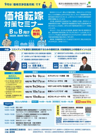 滋賀県商工会連合会(住所:大津市打出浜2番1号 コラボしが21 5階、会長:上西 保)は、滋賀県と共催し、滋賀県内の中小・小規模事業者を対象に、9月から10月にかけて、県内5カ所で「価格転嫁対策セミナー」(BtoB 製造業・建設業下請け向け)を開催します。