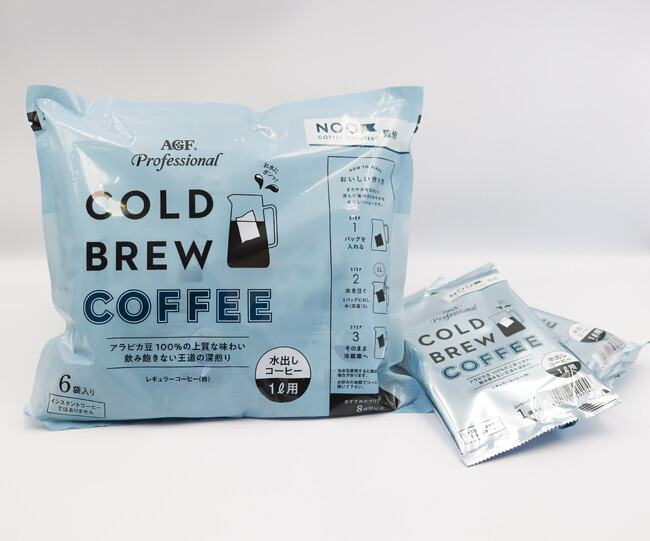 「AGF(R)プロフェッショナル」 コールドブリューコーヒー1L用は、味の素AGFが業務用市場向けに展開する「AGF(R)プロフェッショナル」の水出しコーヒーシリーズの商品です。1リットル分の水出しコーヒーパックを個包装することで風味の劣化を抑え、設備を必要とせず手軽にパックで仕込むことができます。今回NOG COFFEE ROASTERSが監修したことで、クオリティと現場目線を兼ね備えたリニューアル製品として仕上がっています。