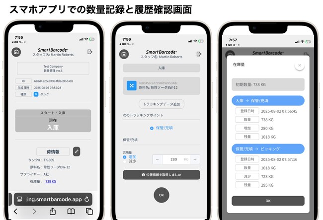 SmartBarcodeの管理画面上で、サプライチェーン上にある数量管理を行うトラッキングポイントを設定することで、スマホアプリの画面から数量の「増加」「減少」を記録することができ、倉庫担当者は補充や持ち出しの履歴を確認することができます。