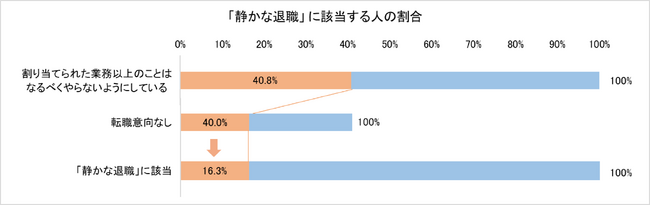しかし、必要最低限の業務だけを行なう人たちの中には、転職の意思なく会社に居続ける「静かな退職」のほかに、転職に意識が向いているために余計な仕事をしない人たちも含まれていると考えられます。そこで、「割り当てられた業務以上のことはなるべくやらないようにしている」人(40.8%)の転職意向を確認したところ、「転職意向あり」は59.0%、「転職意向なし」は40.0%でした(図3)。このことから、「静かな退職」状態にある人は40.8%×40.0%、つまり、全体の16.3%存在すると推定されます。(図4)