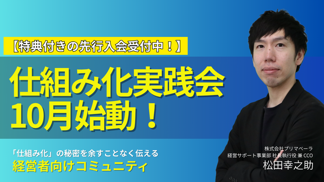 北関東を中心に4事業部55店舗を展開し、16期連続増収増益を続ける株式会社プリマベーラ(群馬県太田市/代表 新井英雄)は、経営サポート事業部 社長執行役・松田幸之助が主宰する経営者向けコミュニティ「仕組み化実践会」を2025年10月より開始します。「あたたかく強い組織」をつくるための“仕組み化経営”を、オンライン勉強会とリアルイベントのハイブリッドで学び、実践・共有できる場を提供します。先行入会者限定特典もございますので、ぜひお早めにお申し込み下さい。