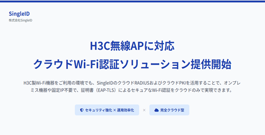 表取締役CEO:石川 貴章、以下SingleID)は、H3C Technologies社製の無線アクセスポイント(AP)およびクラウド管理機能との動作検証を行い、問題なく利用できることを確認したことをお知らせいたします。