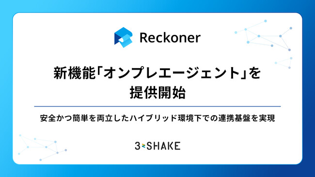 株式会社スリーシェイク(本社:東京都新宿区、代表取締役社長:吉田 拓真、以下スリーシェイク)は、スリーシェイクが提供するクラウド型データ連携ツール「Reckoner(レコナー)」において、オンプレミス環境とのセキュアなデータ連携を可能にする新機能「オンプレエージェント」の提供を開始したことをお知らせします。