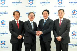 (左から、サーブ・バイオファーマ株式会社 取締役会長兼最高科学責任者 小戝 健一郎、サーブ・バイオファーマ株式会社 代表取締役社長 山田 昌樹、日本臓器製薬株式会社 代表取締役社長 小西 崇⽂、日本臓器製薬株式会社 R&D統括本部長 武岡 裕一)