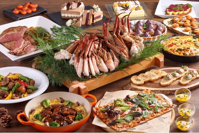 殻付きのボイルマルズワイガニの他、プライムビーフを使用したローストビーフやサツマイモと豚肉の黒酢炒め、紫芋のタルトレット、ショコラマロン、カボチャのプリンなど秋らしいメニューをご用意します。