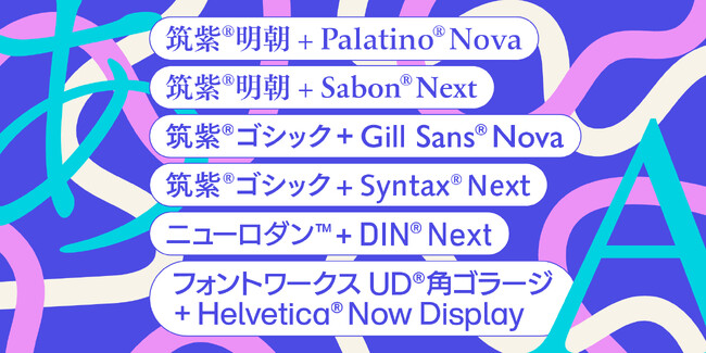 今回、Monotypeを代表する和文・欧文書体である、筑紫(R)ゴシック、筑紫(R)明朝、フォントワークス UD(R)角ゴ_ラージ、ニューロダン(TM)、Gill Sans(R) Nova、Helvetica(R) Now Display、Palatino(R) Nova、DIN(R) Next、Syntax(R) Next、Sabon(R) Nextを組み合わせました。