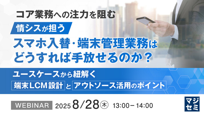 マジセミ株式会社は「コア業務への注力を阻む、情シスが担うスマホ入替・端末管理業務はどうすれば手放せるのか?」というテーマのウェビナーを開催します。