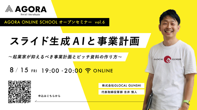 株式会社AGORAでは、2025年8月15日(金)に「生成AIを活用した事業計画とピッチ資料」をテーマにした創業WEBセミナーを開催します。登壇者は、起業家や新規事業を考えている方・AI技術に興味がありビジネスに活かしたい方のために、2024年には400以上の起業家にAIを活用した事業アドバイスを行なった吉井慎人(よしいまこと)氏です。