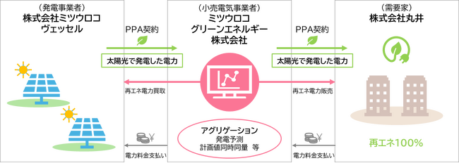 本事業は、MVが新規で開発した太陽光発電所で発電される、追加性※2のある電力および環境価値を、丸井が所有する東京都内の施設(以下、「本物件」)に、MGEがフィジカル PPA※3 の形式を用いて供給いたします。また、フィジカル PPA で賄いきれない電力については、RE100に対応する電力メニュー「ミツウロコグリーンプラン」※4 を提供することで、本物件の使用する電力において再生可能エネルギー(以下「再エネ)100%、CO2 排出量ゼロを実現いたします。